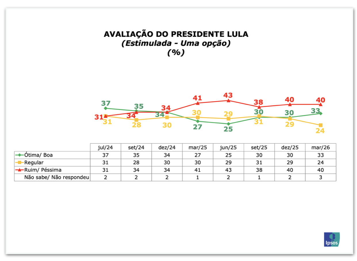 Levantamento divulgado pela Ipsos/Ipec nesta 3ª feira (10.mar.2026) mostra que 51% dos entrevistados declaram desaprovar a maneira como o presidente Luiz Inácio Lula da Silva (PT) está governando o Brasil, enquanto 43% dizem aprovar. Eis a íntegra do estudo (PDF – 452 kB).