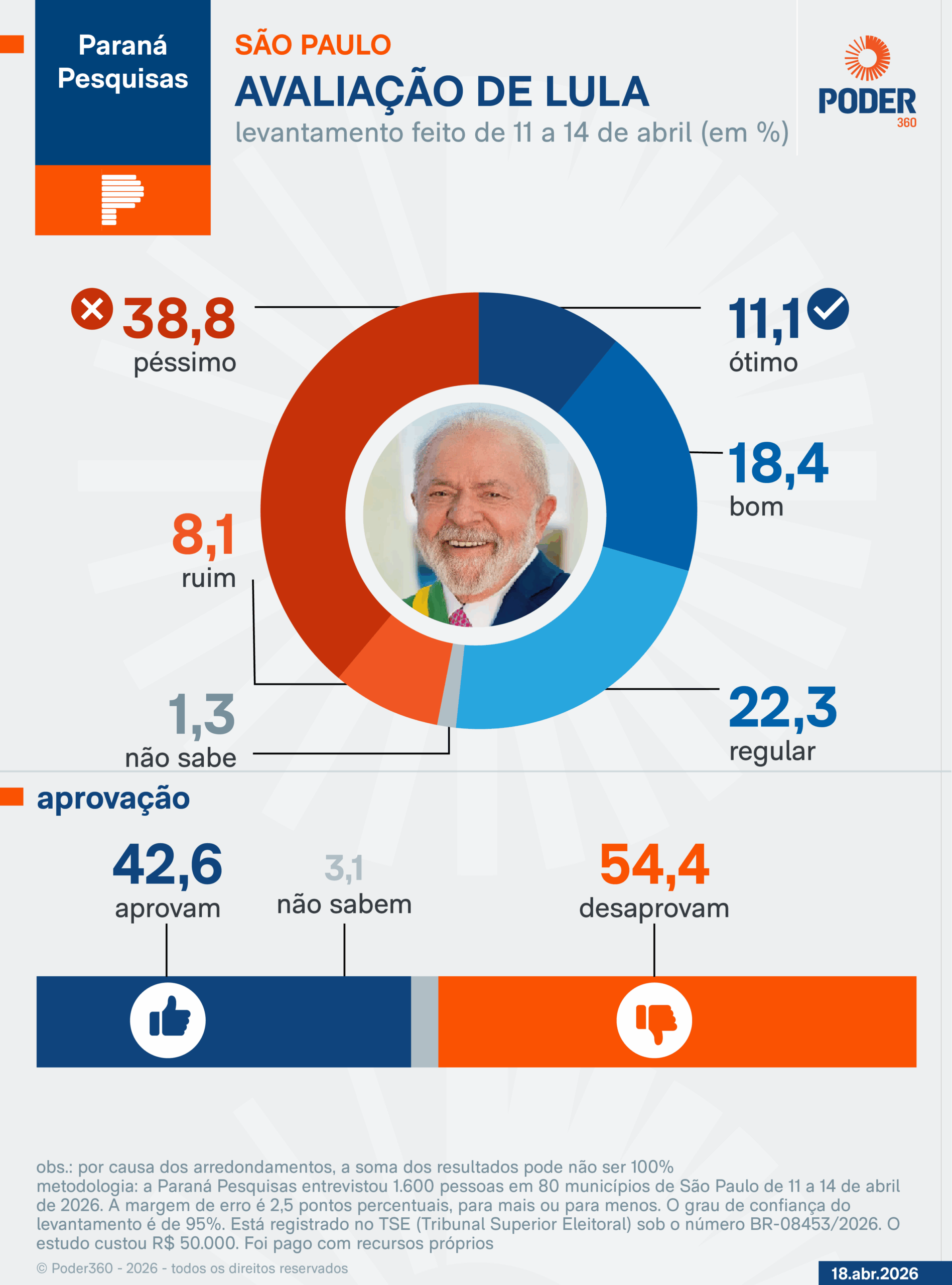 O governo do presidente Luiz Inácio Lula da Silva (PT ) é desaprovado por 54,4% dos eleitores de São Paulo. Os que dizem aprovar somam 42,6%. Os dados são de levantamento da Paraná Pesquisas feito de 11 a 14 de abril.