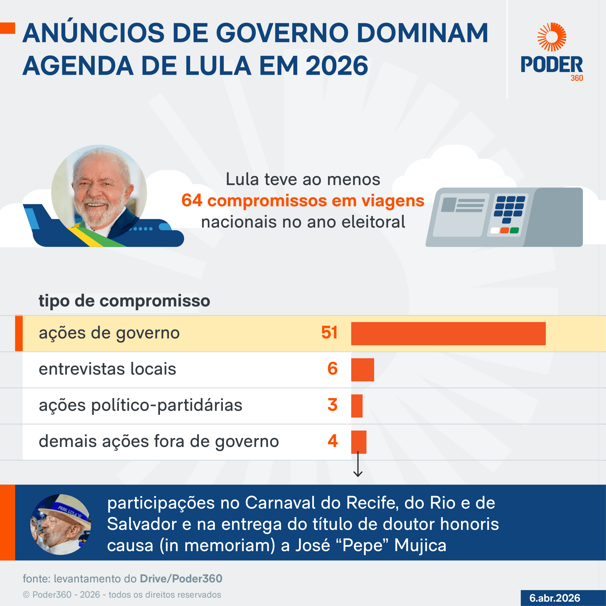 Lula teve ao menos 64 compromissos e 51 deles estão atrelados a anúncios de governo em 2026. Em pelo menos 3 ocasiões, o petista viajou para ações político-partidárias: