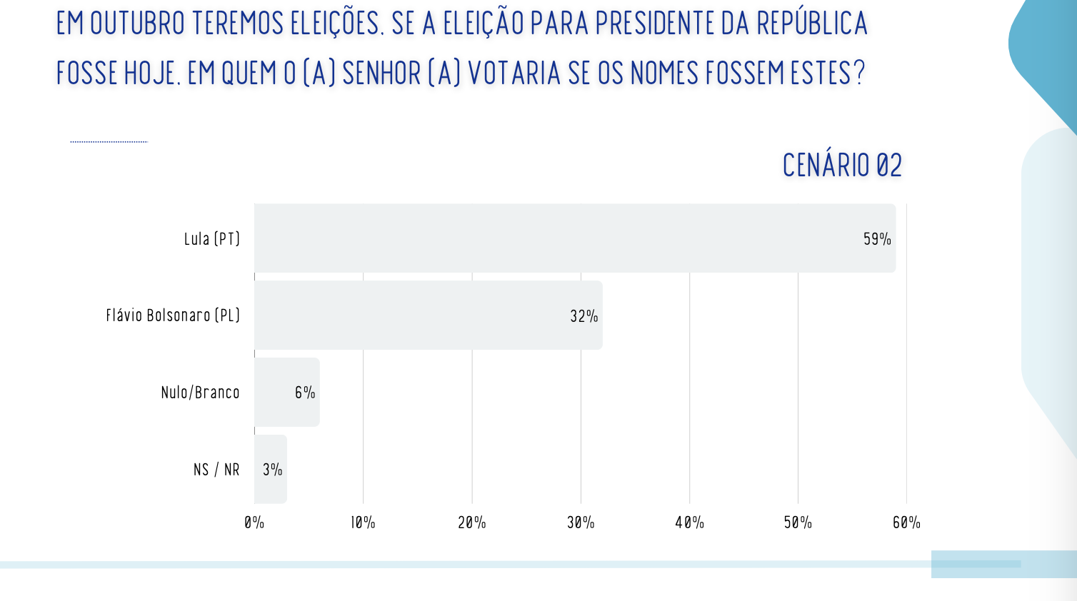 Nos cenários de 2º turno, Lula marca 59%, contra 32% de Flávio Bolsonaro. Brancos e nulos somam 6%, e indecisos, 3%.