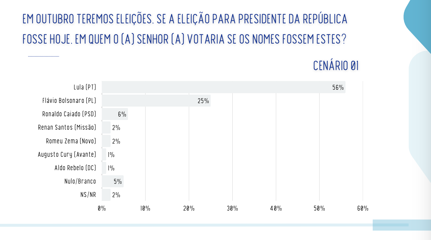 No cenário 1, Lula tem 56%, seguido pelo senador Flávio Bolsonaro (PL), com 25%. Ronaldo Caiado (PSD) aparece com 6%, enquanto Romeu Zema (Novo) e Renan Santos (Missão) têm 2% cada. Aldo Rebelo (Democracia Cristã) e Augusto Cury (Avante) somam 1% cada.