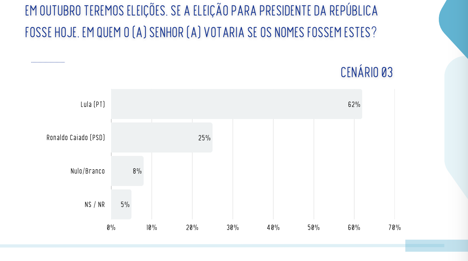 Em um eventual confronto com Ronaldo Caiado, Lula atinge 62%, enquanto o adversário registra 25%. Nesse cenário, brancos e nulos somam 8%, e indecisos, 5%.