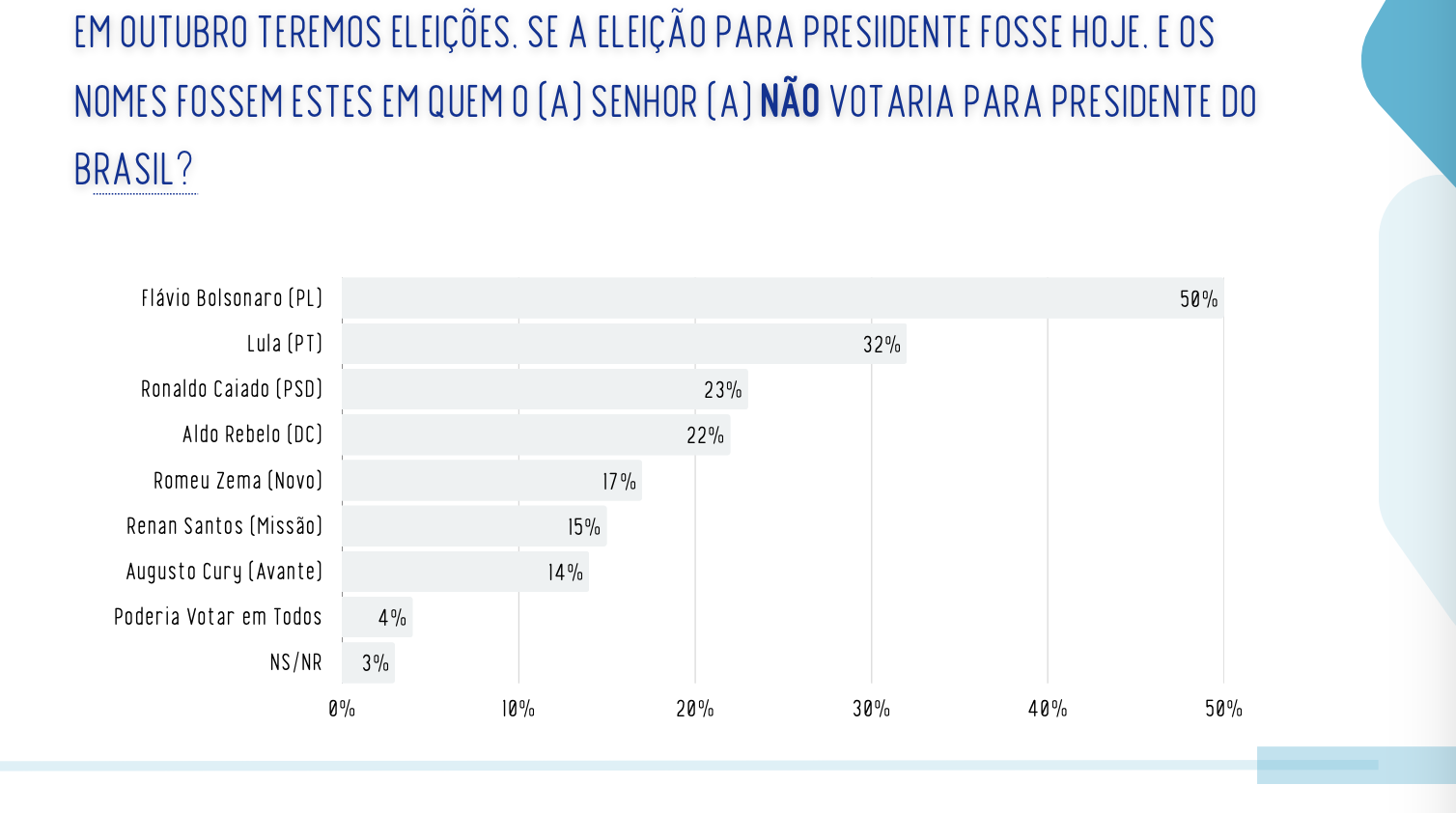 Outros 3% não souberam ou não opinaram, enquanto 4% disseram que poderiam votar em todos.