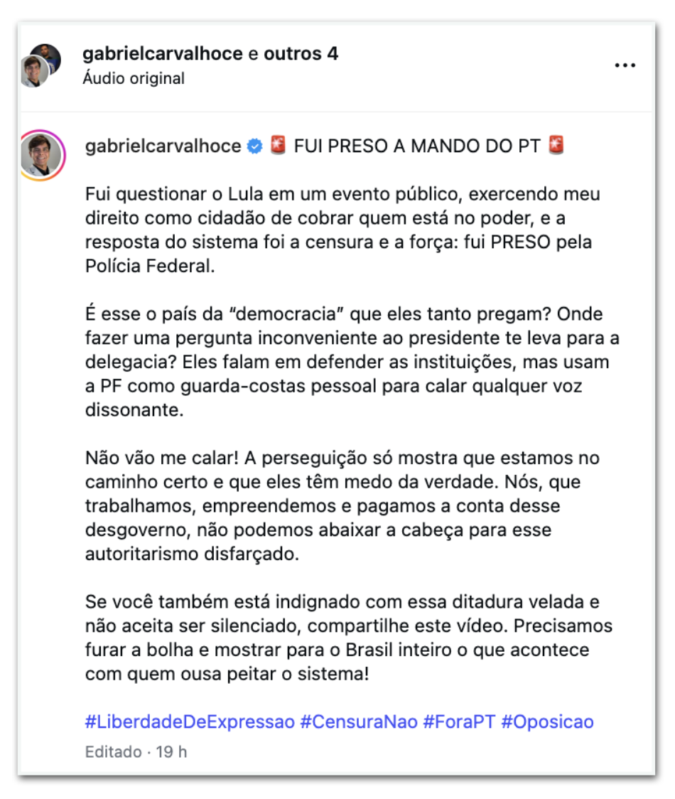 Em publicação nas redes sociais, Gabriel Carvalho, que é influencer, afirmou ter sido “preso a mando do PT” após questionar o presidente durante o evento. O pré-candidato disse que a abordagem foi uma tentativa de silenciar críticas e classificou a ação como “censura” e “autoritarismo”, alegando que exerceu o direito de se manifestar em um espaço público.