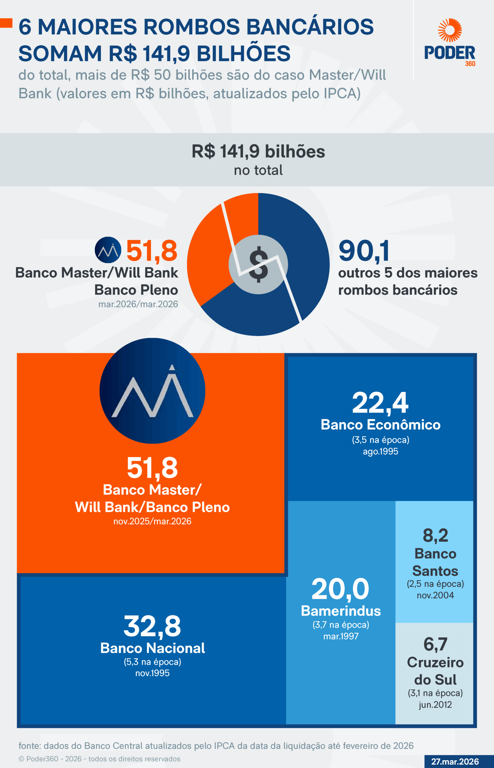 Os 6 maiores rombos bancários somaram R$ 141,9 bilhões no Fundo Garantidor de Crédito. O caso Master representou 37% deste total. As empresas ligadas a Daniel Vorcaro deixaram um prejuízo 58% maior do que o 2º colocado, o Banco Nacional, que teve impacto de R$ 32,8 bilhões em 1995, em valores corrigidos pela inflação.