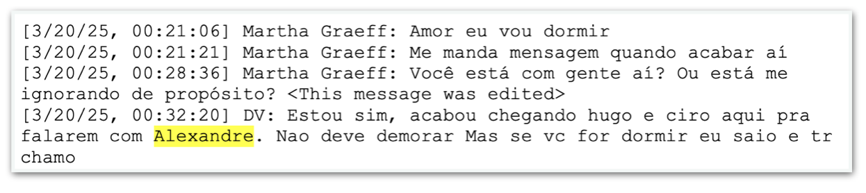 Em 20 de março, também há uma menção ao mesmo nome. Martha fala: “Amor eu vou dormir. Me manda mensagem quando acabar aí”. E questiona: “Você está com gente aí? Ou está me ignorando de propósito?” Vorcaro responde: “Estou sim, acabou chegando Hugo e Ciro aqui pra falarem com Alexandre. Nao deve demorar. Mas se vc for dormir eu saio e tr chamo”.