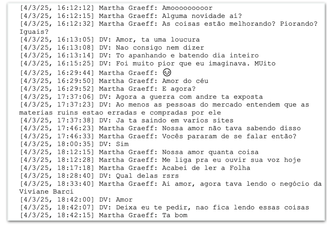 As mensagens no celular de Vorcaro também citam a advogada e mulher de Moraes, Viviane Barci. Em 3 de abril de 2025, Martha diz: “Ai amor, agora tava lendo o negócio da Viviane Barci”. Vorcaro responde: “Amor, deixa eu te pedir, nao fica lendo essas coisas”.