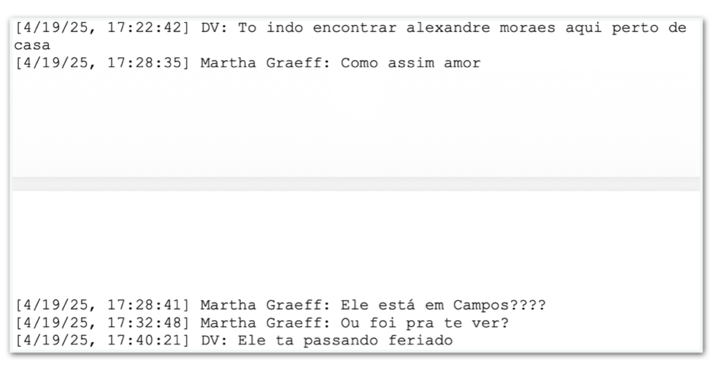 No dia 19 de abril de 2025, um sábado, Vorcaro informa Martha sobre um encontro com o Moraes.
