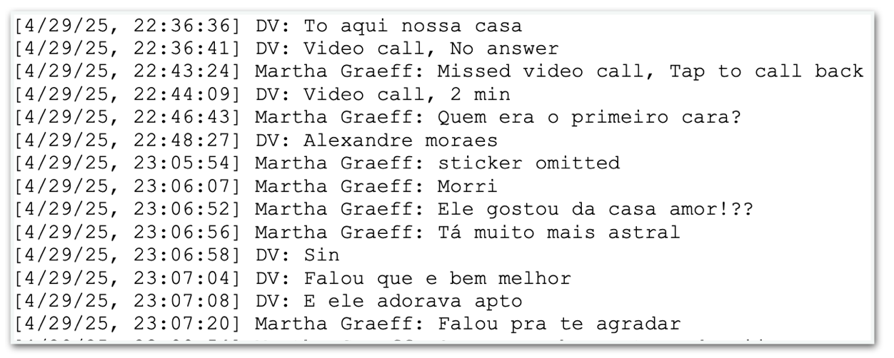 Após uma videochamada, Martha pergunta sobre a identidade de uma pessoa que teria visto durante a ligação: “Quem era o primeiro cara?”. A resposta de Vorcaro responde: “Alexandre Moraes”.