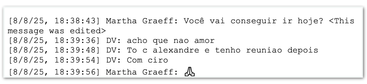 Há outras menções ao nome “Alexandre” nos diálogos do banqueiro. Em 8 de agosto, Martha pergunta: “Você vai conseguir ir hoje?”. Vorcaro responde: “To c alexandre e tenho reuniao depois Com ciro”. Não fica claro se, nessa ocasião, o homem em questão era Alexandre de Moraes.