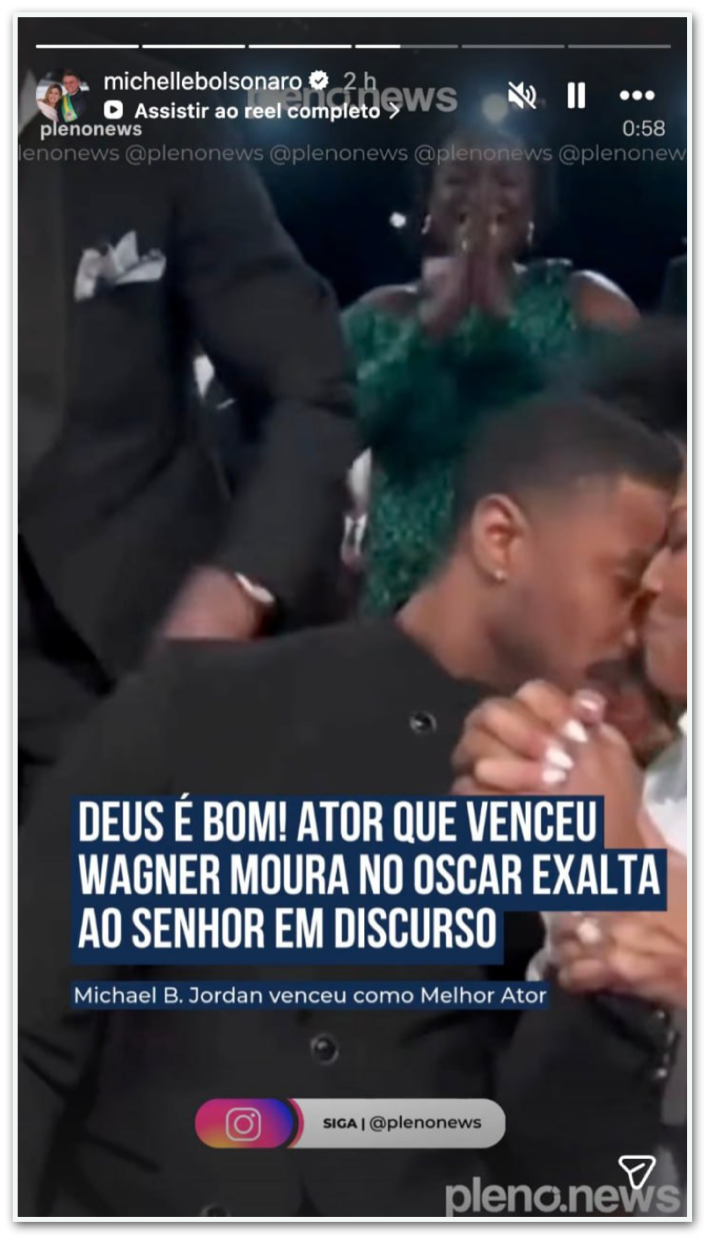 Michelle compartilhou nos Stories do Instagram uma publicação que destaca o discurso feito por Jordan ao receber a estatueta pelo filme “Pecadores”. O filme, dirigido por Ryan Coogler, é um suspense sobrenatural sobre gêmeos que retornam à cidade natal. “Deus é bom”, declarou o ator em seu discurso ao aceitar o prêmio.
