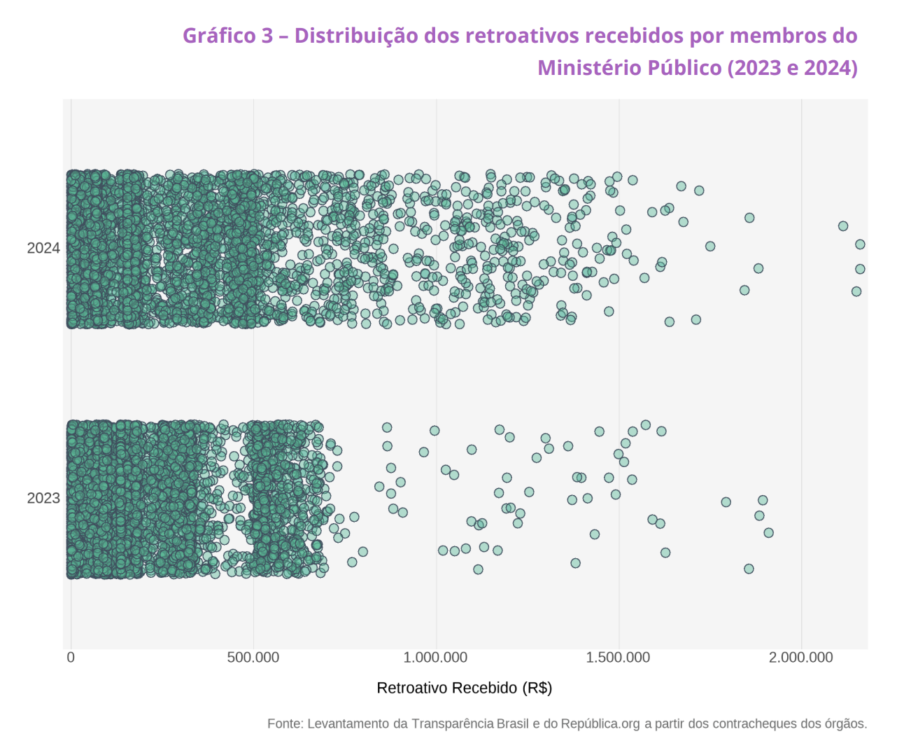 “A análise detalhada dos pagamentos brutos revela que os retroativos, sozinhos, contribuem para inflar contracheques de membros do sistema de justiça de forma a ultrapassar o teto constitucional de remunerações”, diz o estudo.