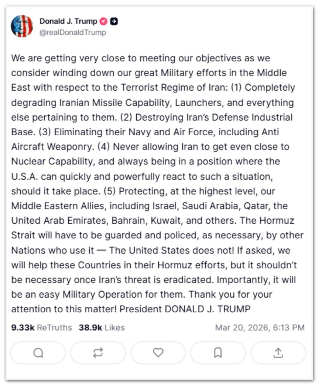 Na publicação, Trump afirmou que Washington busca desarticular as capacidades estratégicas do regime iraniano, impedir qualquer avanço nuclear e manter proteção reforçada a aliados dos EUA no Oriente Médio.