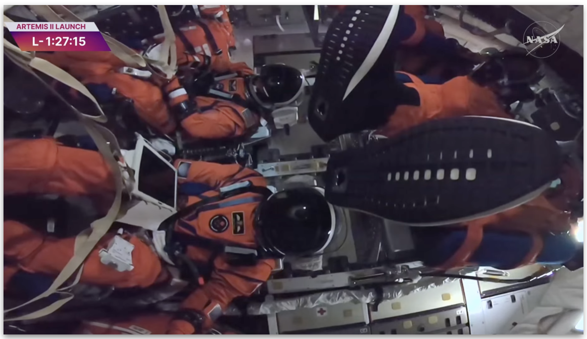 Na imagem, os 4 astronautas da Nasa dentro da Artemis 2, cerca de 1 hora antes do lançamento