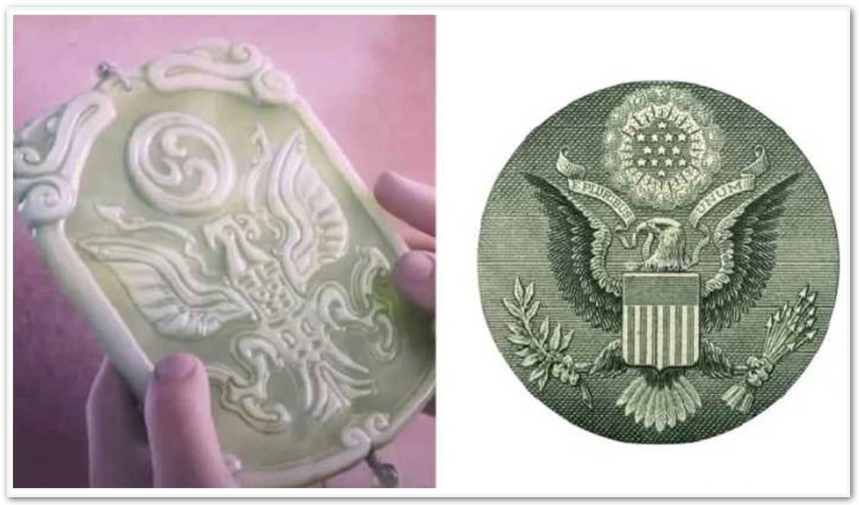 À esquerda, o emblema dos “imortais” (“o mal”) apresentado no filme “Ne Zha”, e, à direita, o escudo nacional dos EUA