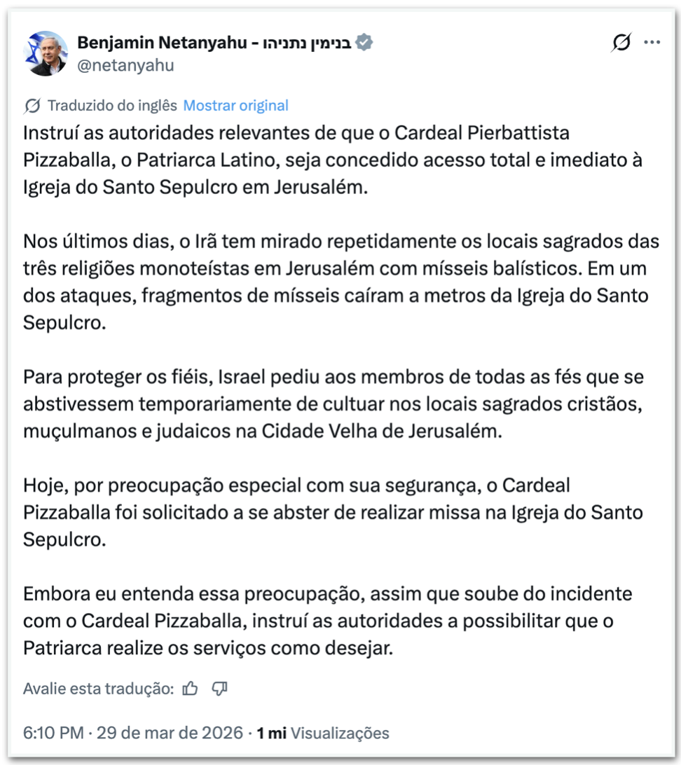 O primeiro-ministro de Israel, Benjamin Netanyahu, determinou neste domingo (29.mar.2026) que a polícia permita o acesso do cardeal Pierbattista Pizzaballa à Igreja do Santo Sepulcro, em Jerusalém, e autorize a realização de celebrações religiosas no local. A decisão ocorreu depois de forças policiais israelenses impedirem a entrada do Patriarca Latino no templo durante o Domingo de Ramos. O episódio provocou reações de governos de diversos países, incluindo o Brasil.