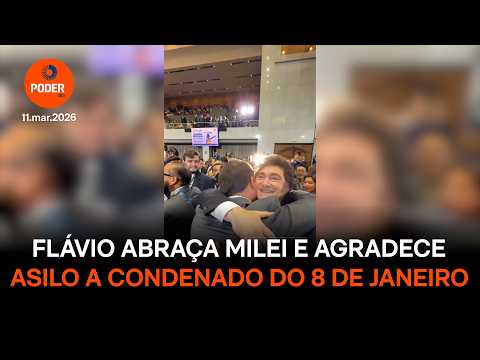 O senador e candidato à Presidência Flávio Bolsonaro (PL-RJ) publicou nesta 4ª feira (11.mar.2026) um vídeo em que agradece ao presidente argentino, Javier Milei (La Libertad Avanza, direita), pela concessão de asilo político a um condenado pelos atos de 8 de Janeiro.