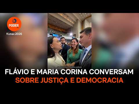 Durante o evento, Flávio também cumprimentou a líder da oposição da Venezuela, María Corina Machado. O senador parabenizou a venezuelana pela conquista do Prêmio Nobel da Paz e disse que ela é “uma grande inspiração” para o Brasil. Os 2 falaram em “justiça e democracia” para os 2 países.