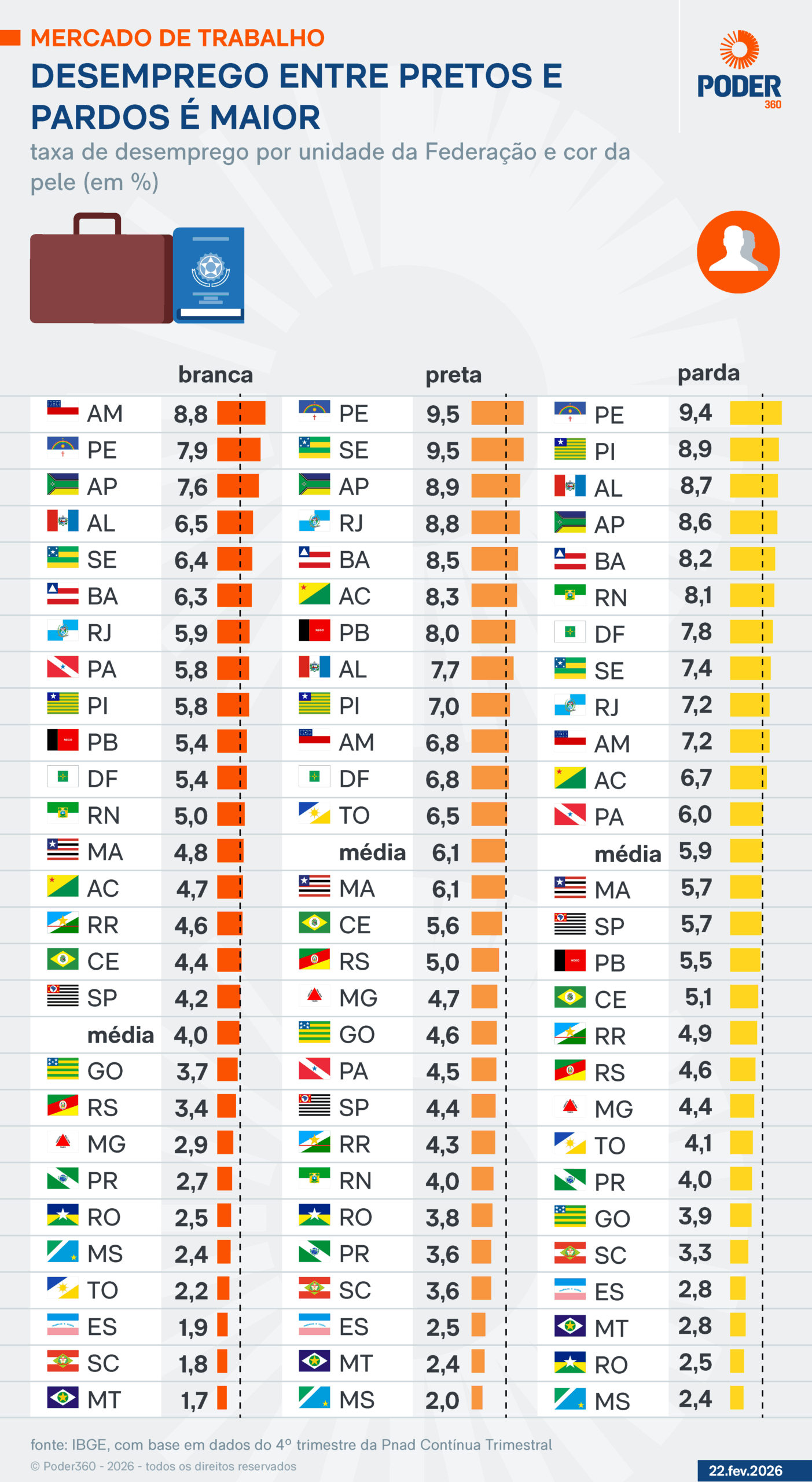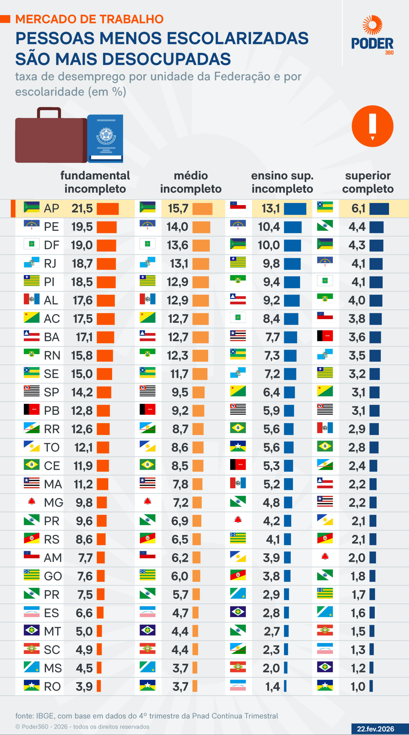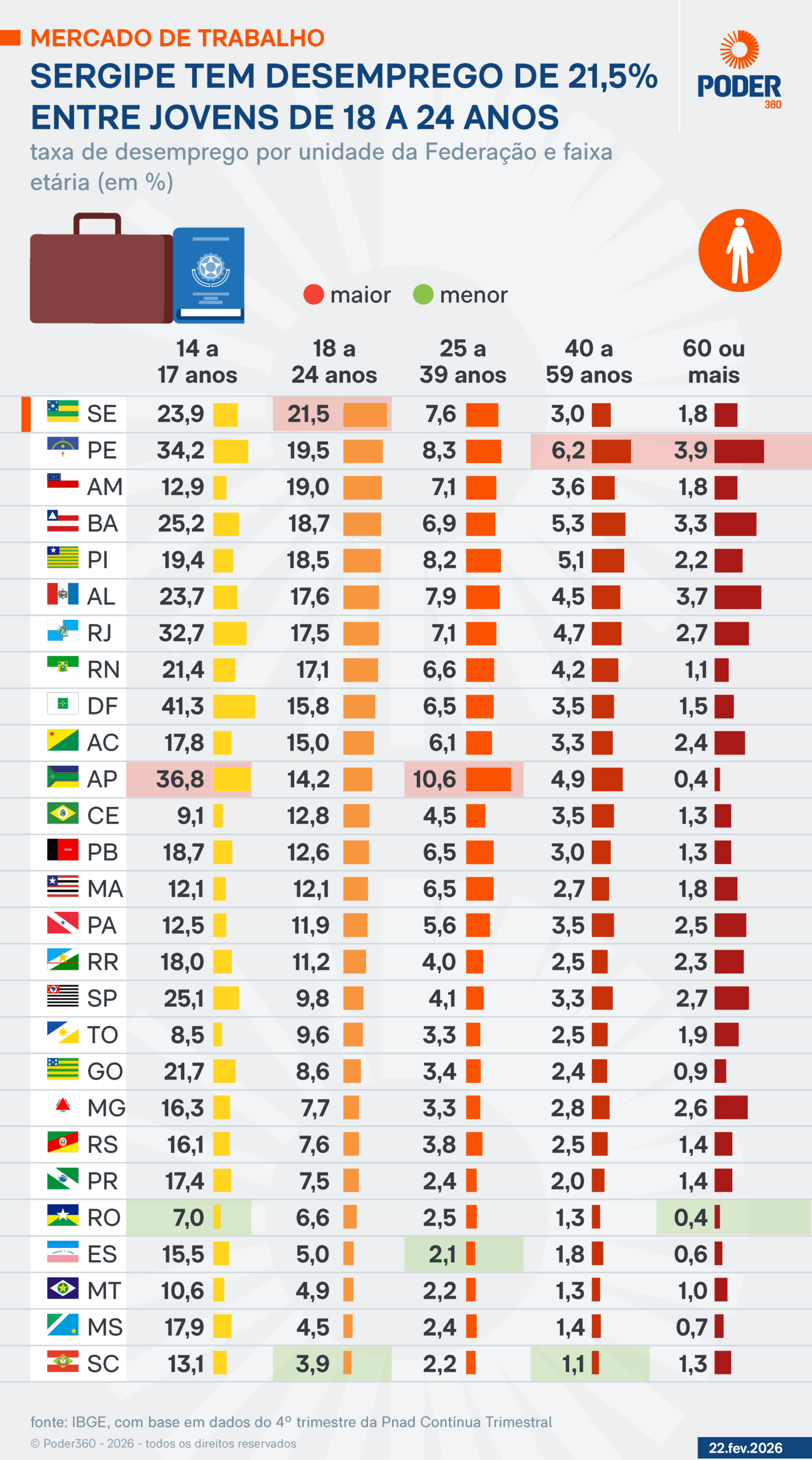 O Poder360 já mostrou que a taxa de desemprego entre as pessoas de 18 a 24 anos atingiu 11,4% no 4º trimestre, o menor patamar da série histórica, iniciada em 2012. Apesar da queda, o nível pode ser de até 21,5% no Brasil, como é o caso do Estado de Sergipe. Há 15 Estados acima do percentual de 11,4% (média nacional).