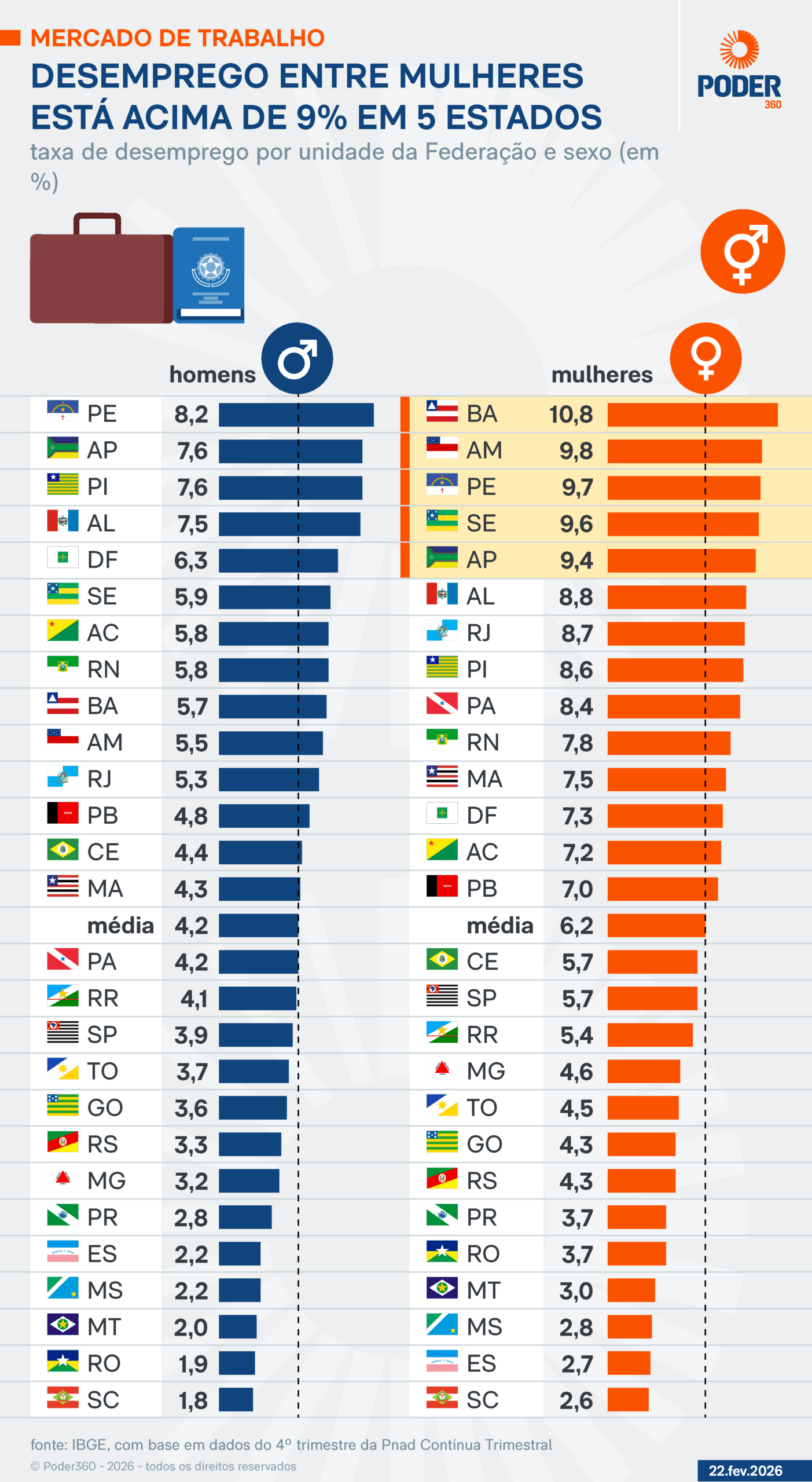 A taxa de desemprego entre as mulheres estava acima da média (6,2%) em 14 unidades da Federação, sendo 8 do Nordeste e 4 do Norte. Todos os Estados do Sul e Sudeste têm taxa de desemprego abaixo da média entre homens e mulheres.