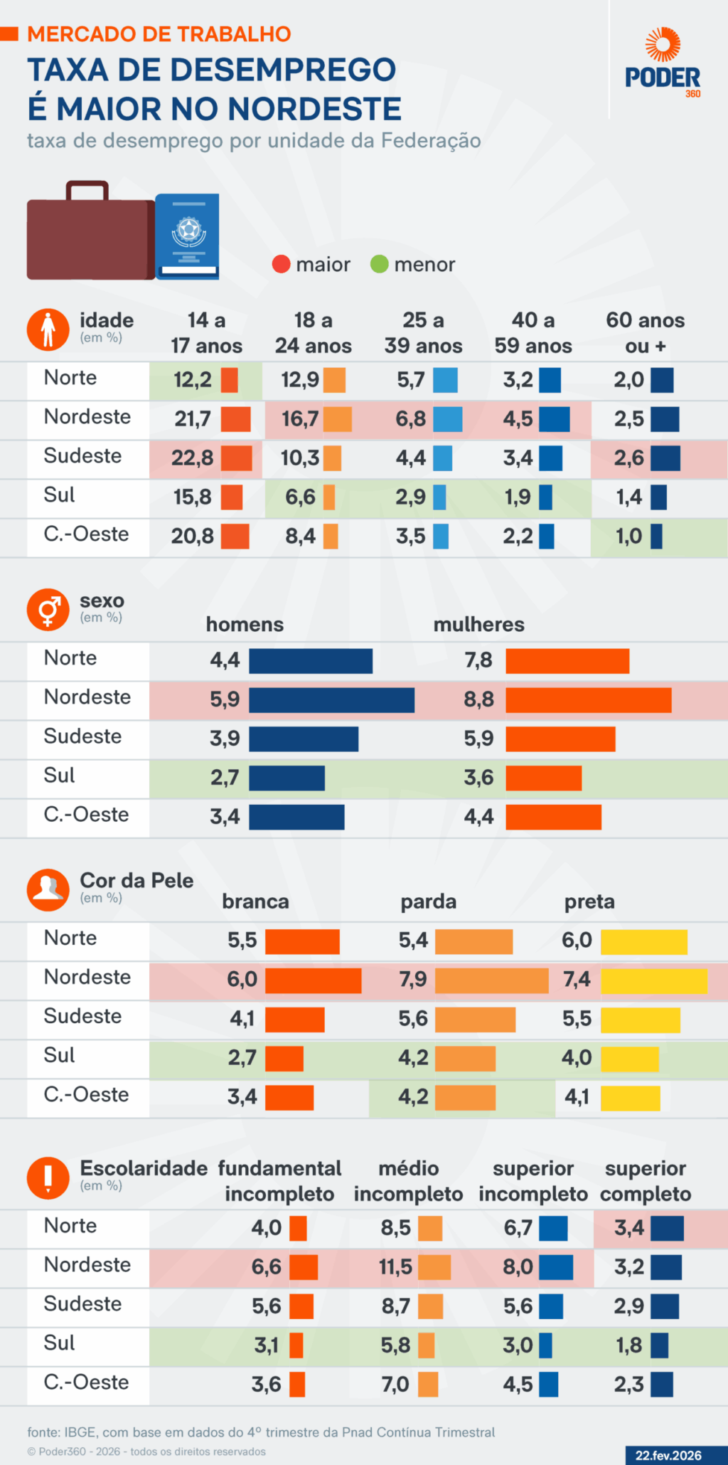 Todos os 9 Estados do Nordeste estão entre as 15 unidades da Federação com as maiores taxas de desocupação entre os jovens de 18 a 24 anos. Há ainda 4 da região Norte, um do Sudeste e um do Centro-Oeste.