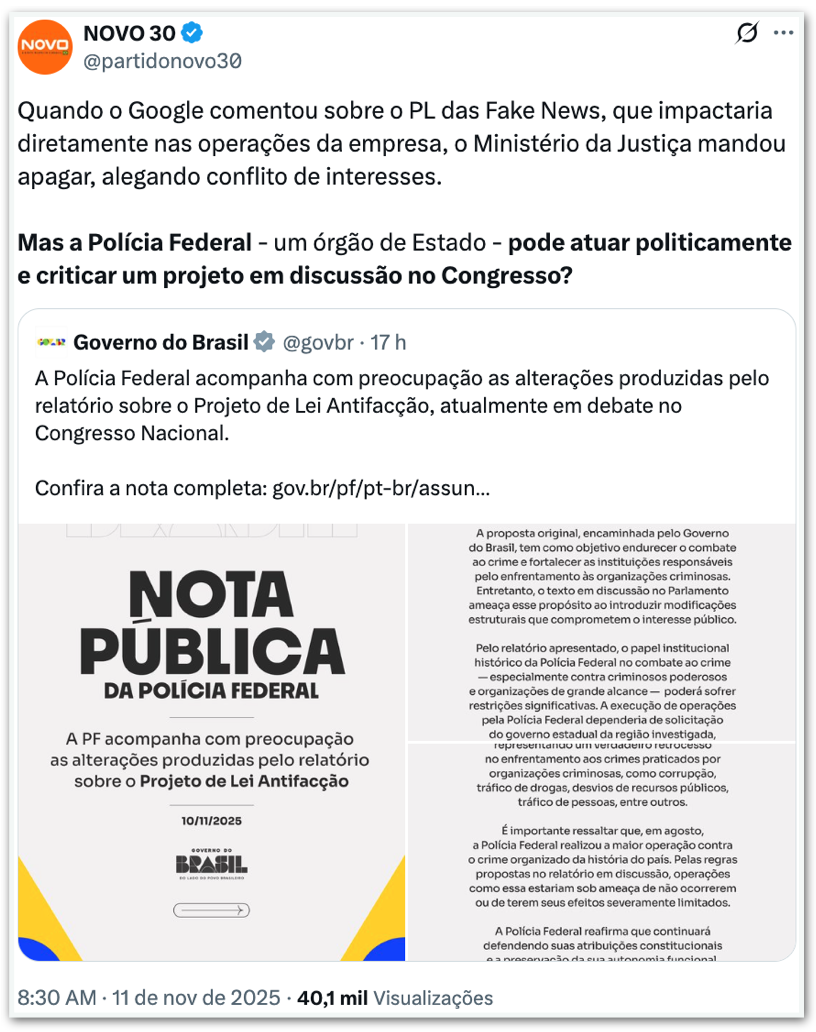“Quando o Google comentou sobre o PL das Fake News, que impactaria diretamente nas operações da empresa, o Ministério da Justiça mandou apagar, alegando conflito de interesses. Mas a Polícia Federal –um órgão de Estado– pode atuar politicamente e criticar um projeto em discussão no Congresso?”, escreveu o partido em seu perfil no X.