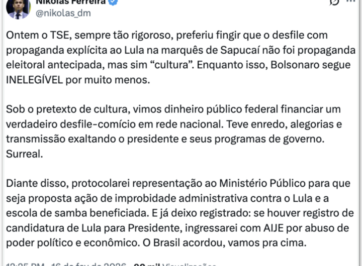 Nikolas diz que acionará MP contra Lula e Acadêmicos de Niterói Geral Nikolas diz que acionará MP contra Lula e Acadêmicos de Niterói RealRadioTvBrasil fevereiro 16, 2026