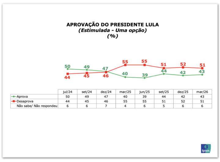 Lula é desaprovado por 51% e aprovado por 43%, diz Ipsos-Ipec 2 min read Geral Lula é desaprovado por 51% e aprovado por 43%, diz Ipsos-Ipec RealRadioTvBrasil março 10, 2026