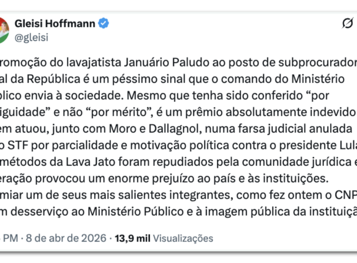 Gleisi critica promoção de procurador da Lava Jato no CNMP 1 min read Geral Gleisi critica promoção de procurador da Lava Jato no CNMP RealRadioTvBrasil abril 8, 2026