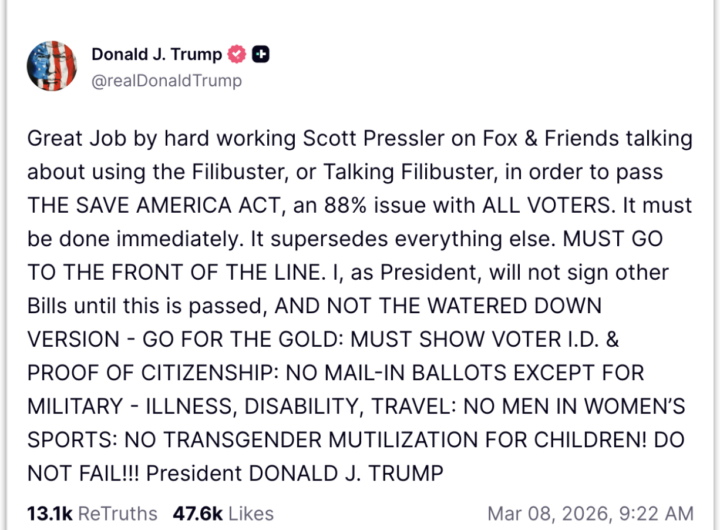 Trump ameaça travar agenda do Congresso até aprovação de lei eleitoral 2 min read Geral Trump ameaça travar agenda do Congresso até aprovação de lei eleitoral RealRadioTvBrasil março 9, 2026