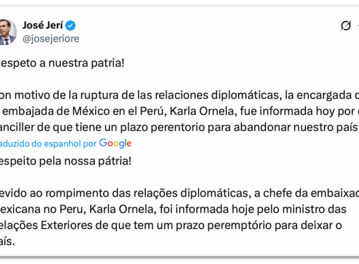 Diplomata mexicana deixa o Peru após pedido de asilo de ex-premiê 2 min read Geral Diplomata mexicana deixa o Peru após pedido de asilo de ex-premiê RealRadioTvBrasil novembro 10, 2025