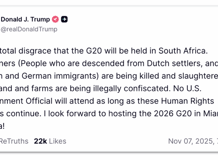EUA não mandarão representante para G20 na África do Sul, diz Trump 2 min read Geral EUA não mandarão representante para G20 na África do Sul, diz Trump RealRadioTvBrasil novembro 8, 2025