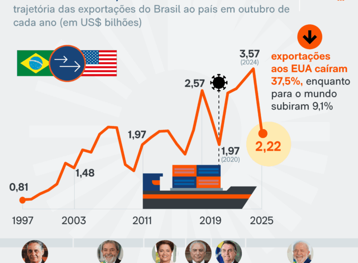 Exportações para os Estados Unidos recuam 37,9% em outubro 2 min read Geral Exportações para os Estados Unidos recuam 37,9% em outubro RealRadioTvBrasil novembro 6, 2025