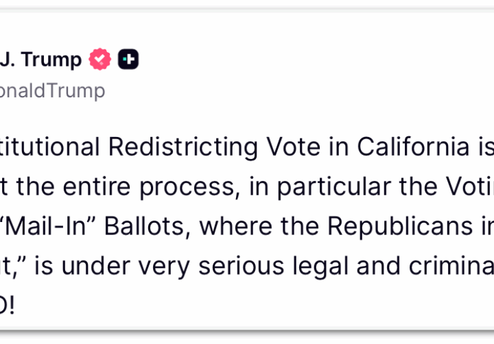 Republicanos acionam Justiça contra novo mapa eleitoral da Califórnia 2 min read Geral Republicanos acionam Justiça contra novo mapa eleitoral da Califórnia RealRadioTvBrasil novembro 6, 2025