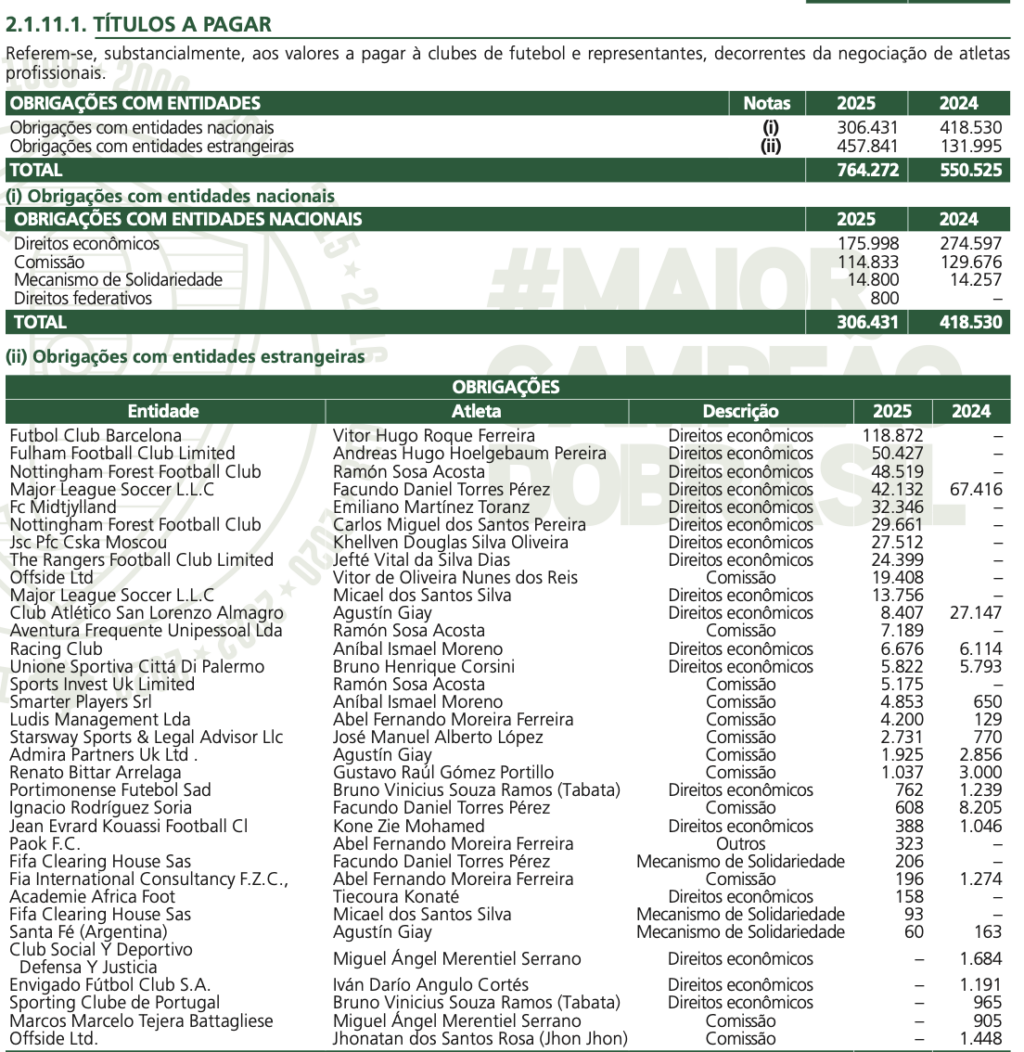 As obrigações estão concentradas principalmente em negociações com clubes do exterior, que somam R$ 457,8 milhões. Compromissos com equipes brasileiras representam R$ 306,4 milhões.