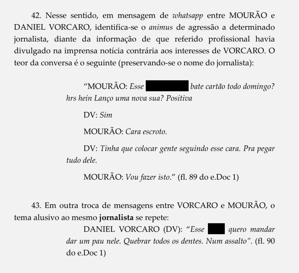 Vorcaro acionou o grupo para ameaçar o jornalista Lauro Jardim, do jornal “O Globo”, que divulgou uma notícia “contrária aos seus interesses“. Segundo a PF, o núcleo de intimidação monitorava os jornalistas, acompanhando sua rotina e coletando informações sigilosas. “Quero dar um pau nele. Quebrar todos os dentes. Num assalto”, disse Vorcaro.