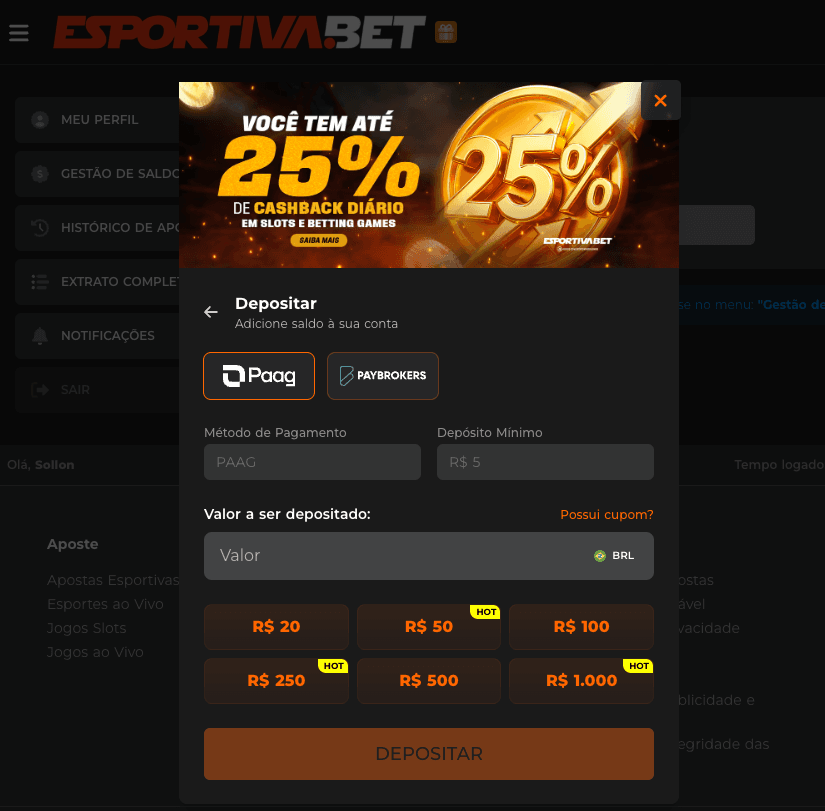 Na verdade, o valor mínimo de depósito via Pix na Esportiva Bet é a partir de R$ 5,00. Para colocar saldo, basta fazer login, clicar em “Depositar”, escolher Pix como método, digitar o valor (mínimo R$ 5,00), gerar o QR Code ou copiar a chave, e confirmar no app do seu banco. O valor entra quase que na hora, e você já pode começar a apostar rapidinho.