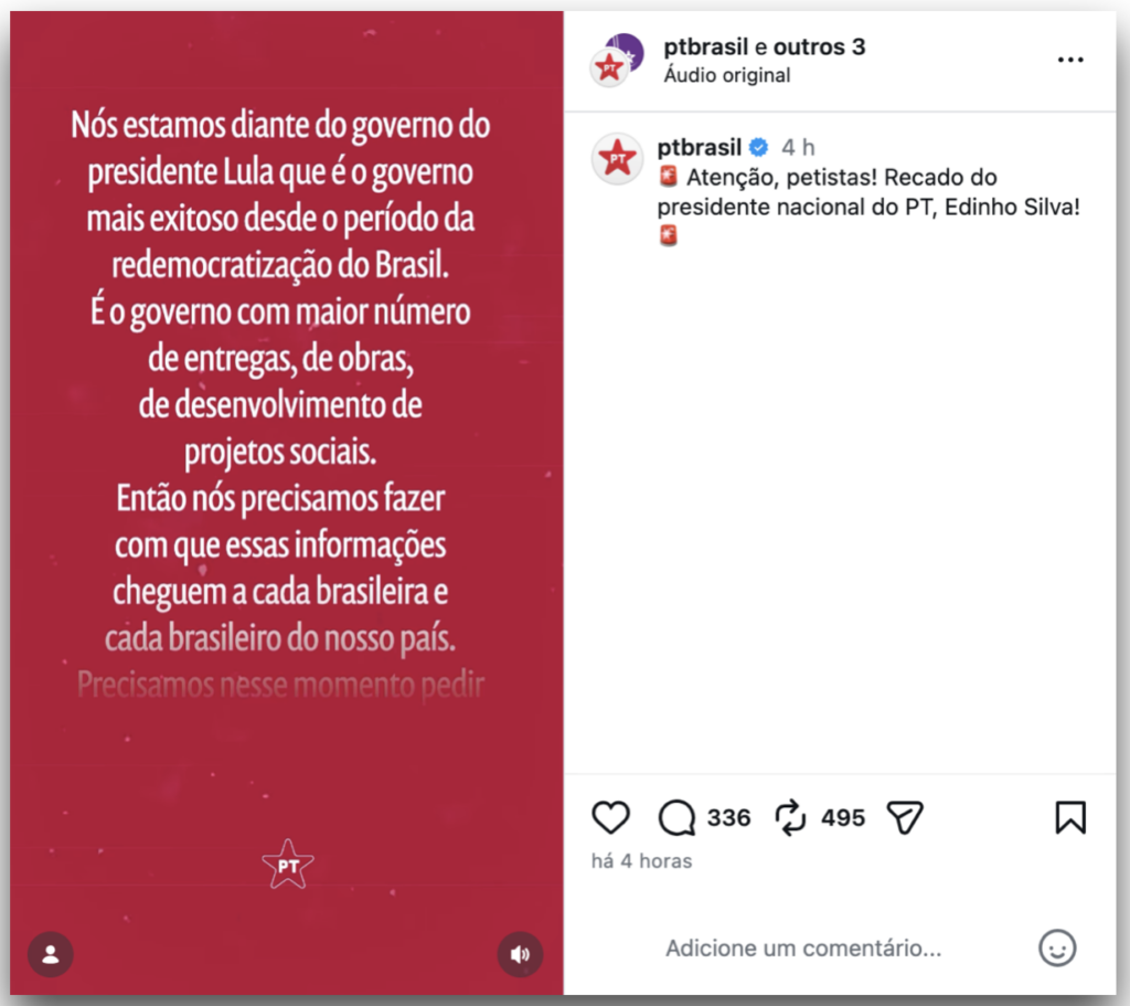 Em mensagem às bases partidárias, Edinho afirmou que o momento exige maior alcance na divulgação de políticas públicas e investimentos federais. “Precisamos, neste momento, pedir que cada brasileiro e brasileira que apoia o presidente Lula, o nosso governo, o nosso projeto, que seja um porta-voz do presidente Lula”, disse.