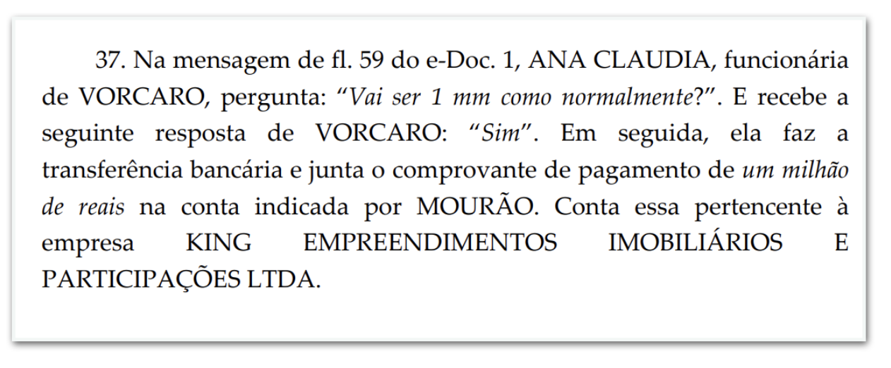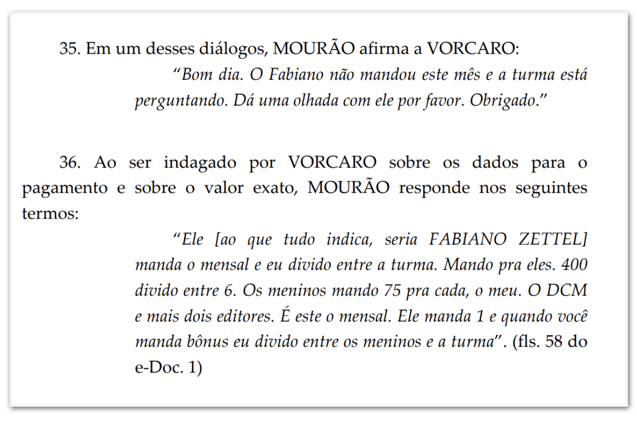 Em uma conversa reproduzida nos autos, Luiz Phillipi Machado de Moraes Mourão afirma a Vorcaro que “o Fabiano não mandou este mês e a turma está perguntando”, em referência aos valores repassados ao grupo. Em seguida, explica que o pagamento seria dividido entre integrantes da estrutura.