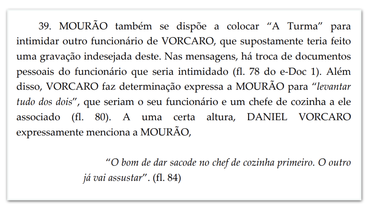 - intimidação de pessoas: “O bom de dar sacode no chef de cozinha primeiro. O outro já vai assustar.”