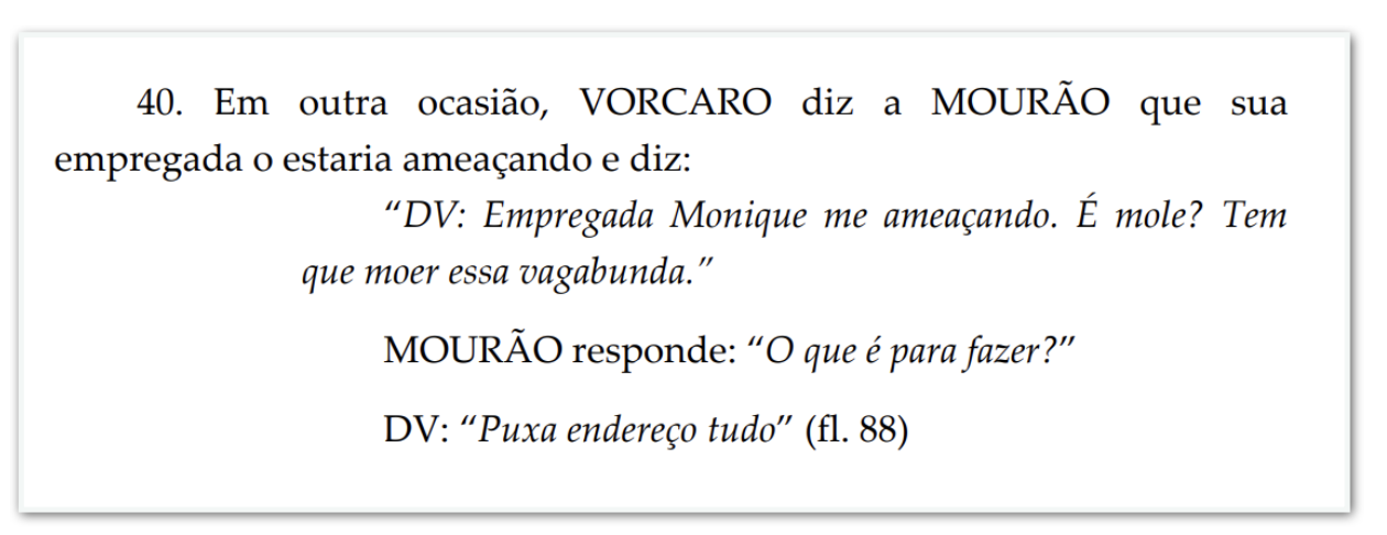 - ameaça a funcionária: “Empregada Monique me ameaçando. É mole? Tem que moer essa vagabunda.”