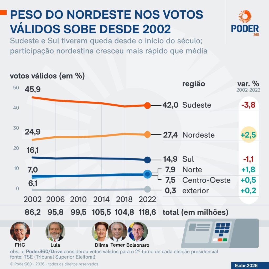 Dados preliminares de 2026 indicam que os sudestinos devem perder ainda mais sua participação no eleitorado. A região tinha 42,6% dos votantes em 2022 e agora tem 41,9%. O número ainda vai mudar porque a Justiça Eleitoral está regularizando os cadastros para a eleição de outubro.