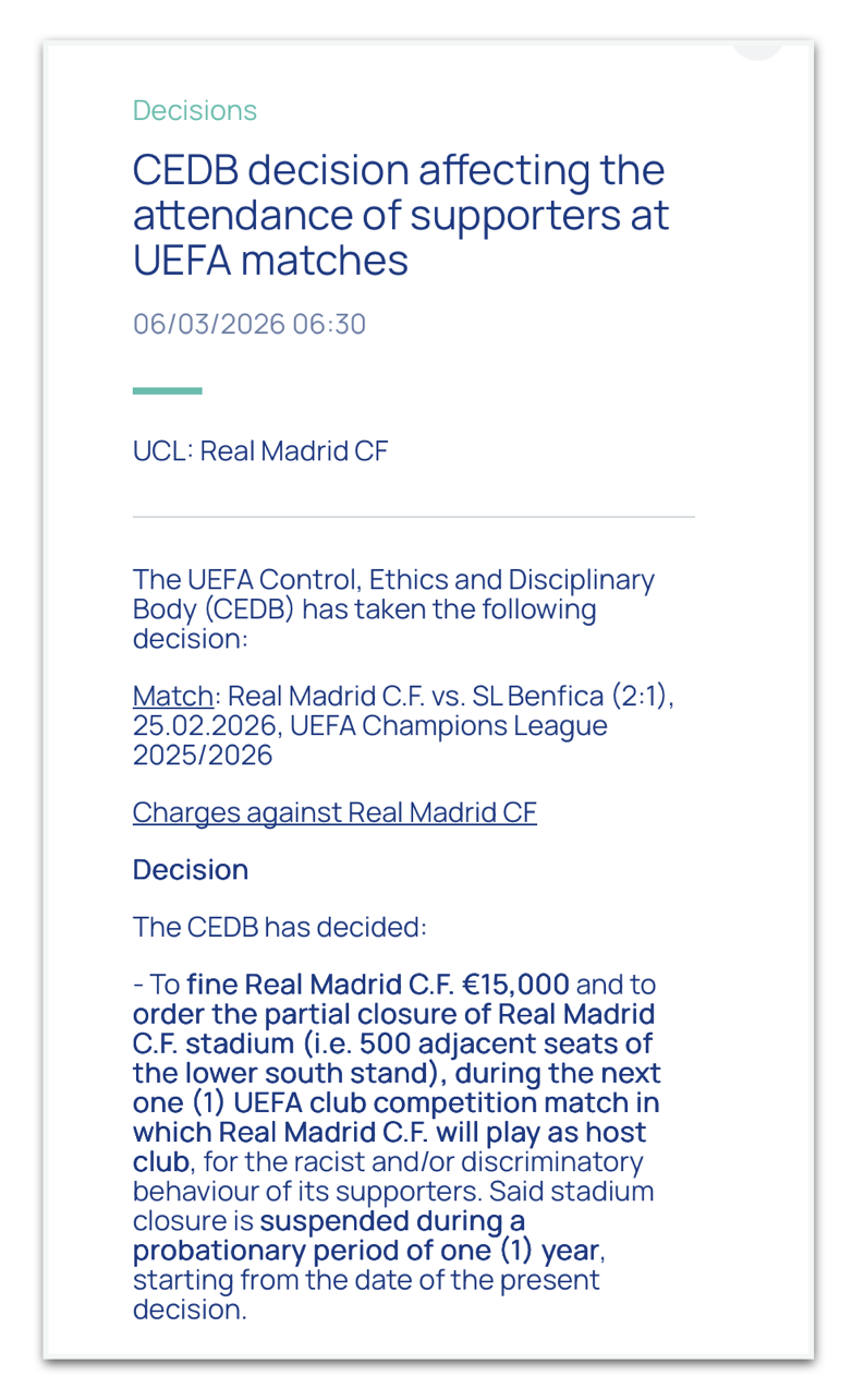 A sanção prevê o fechamento de cerca de 500 assentos na arquibancada inferior do setor sul do Santiago Bernabéu. A medida, no entanto, ficará suspensa e só será aplicada se outro incidente racista ocorrer dentro do período de 12 meses.