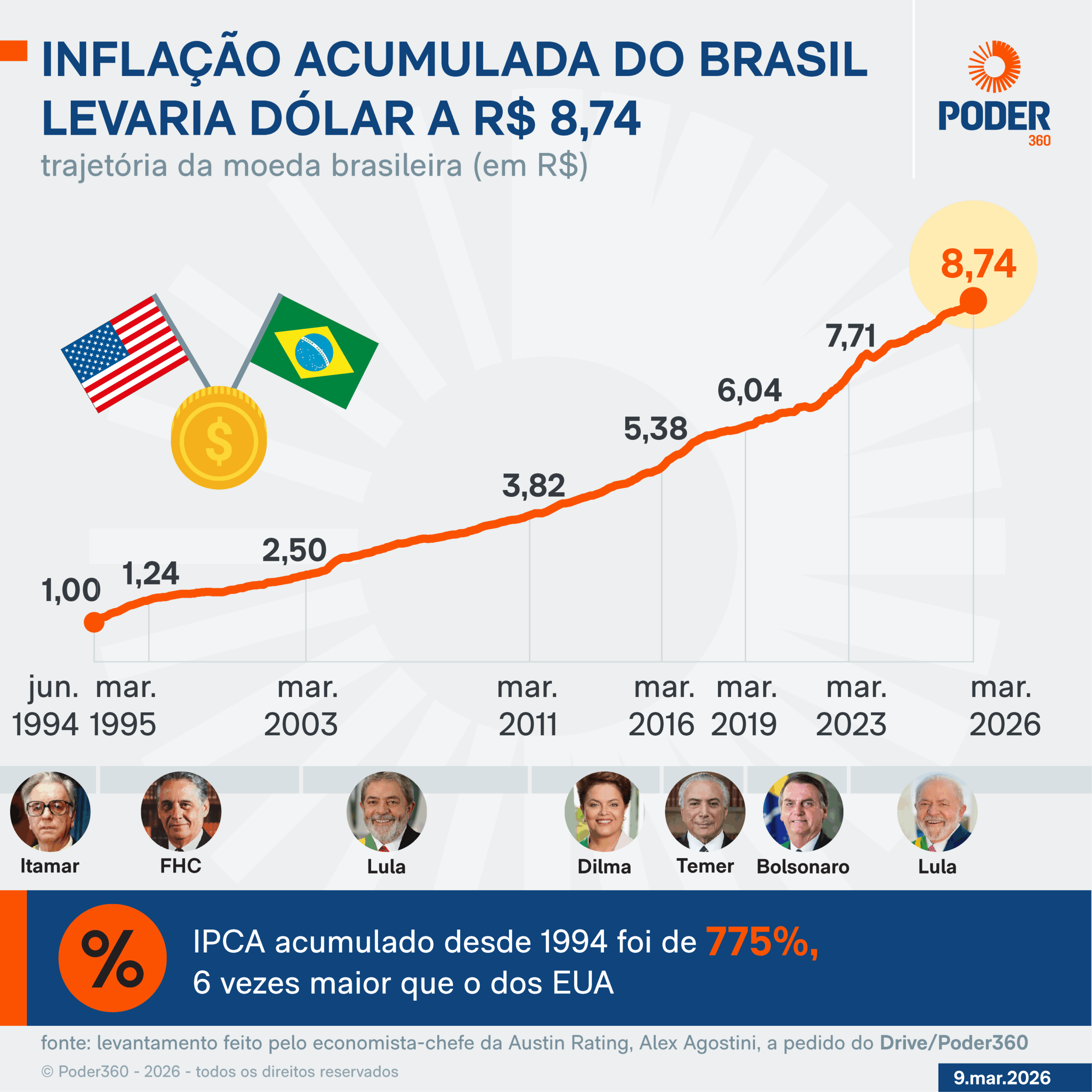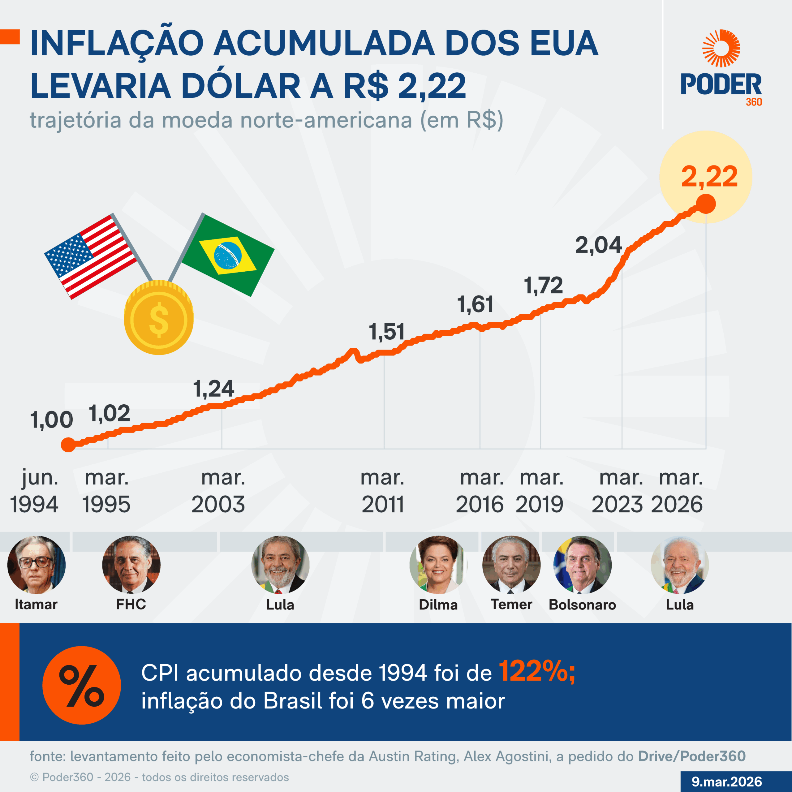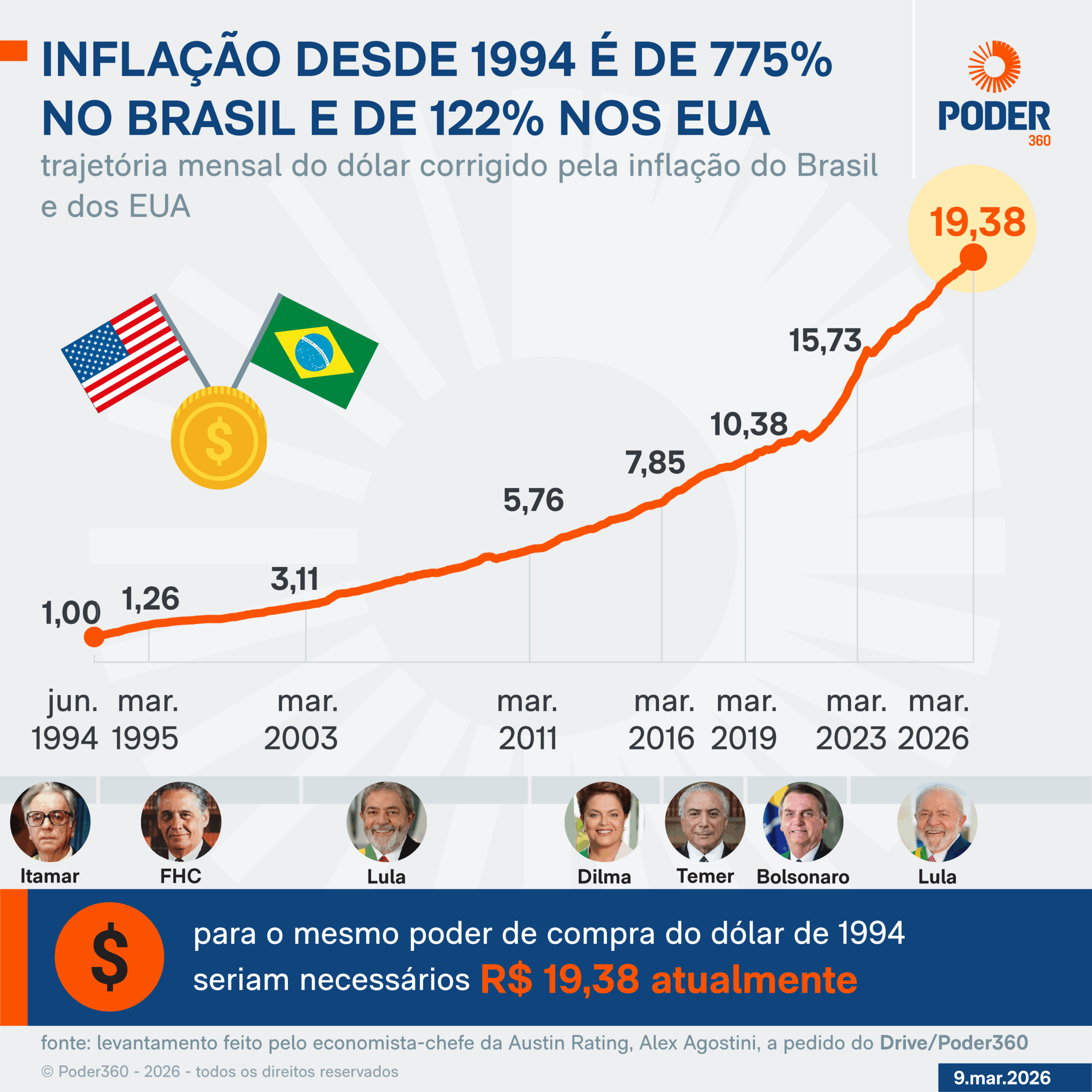 Já se o valor fosse corrigido apenas pela inflação acumulada no Brasil desde 1994, o dólar estaria em R$ 8,74. Na prática, a moeda norte-americana fechou a 2ª feira (9.mar.2026) em R$ 5,16.