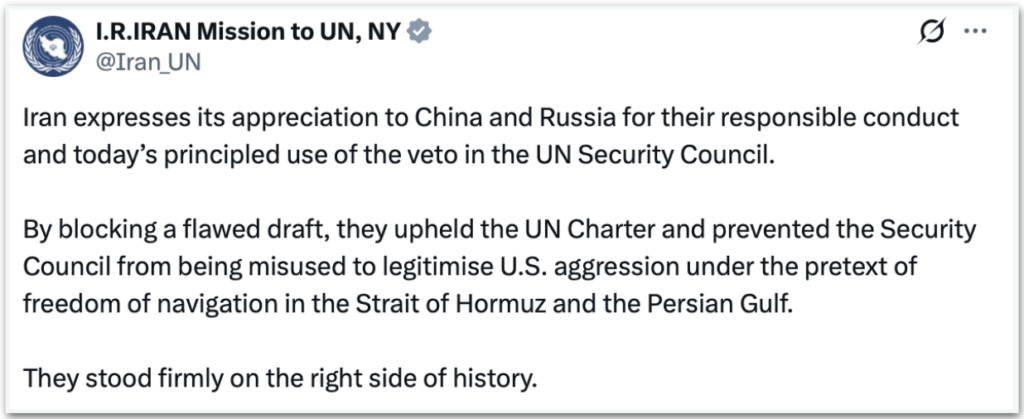 Em mensagem publicada no X (ex-Twitter), a missão diplomática do Irã na ONU agradeceu o posicionamento da Rússia e da China, afirmando que os países estão “do lado certo da história”.