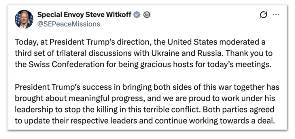 “O sucesso do presidente [Donald] Trump [Partido Republicano] em reunir ambos os lados desta guerra trouxe avanços significativos, e estamos orgulhosos de trabalhar sob sua liderança para interromper as mortes neste terrível conflito. Ambas as partes concordaram em atualizar seus respectivos líderes e continuar trabalhando em direção a um acordo”, escreveu Witkoff na plataforma X.