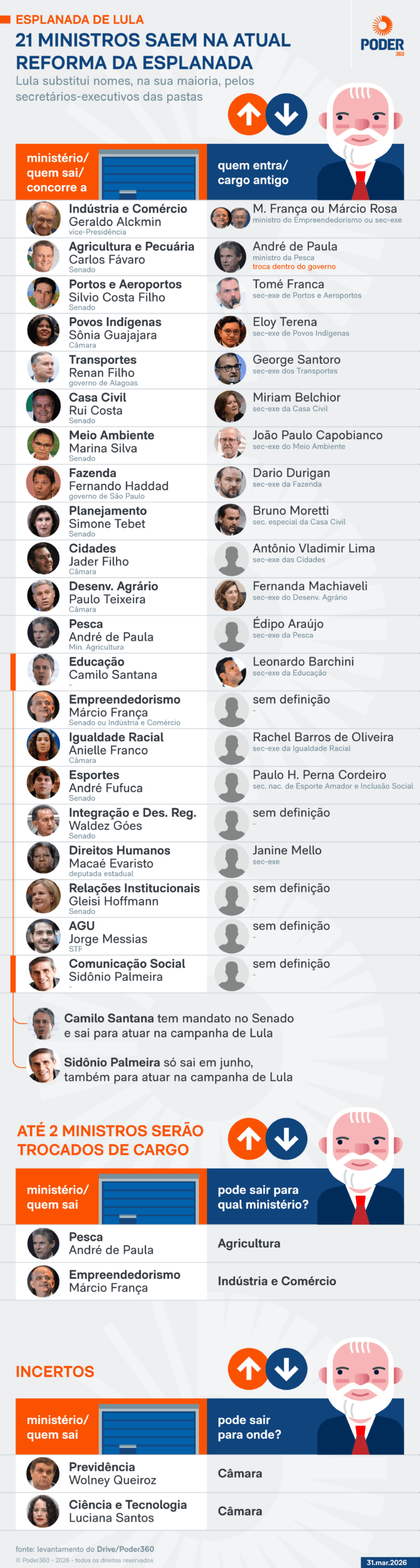 - Leonardo Barchini: assume o Ministério da Educação. Secretário-executivo da pasta, substitui Camilo Santana. Barchini é o atual secretário-executivo do MEC —o número 2 da pasta. Servidor público federal há mais de 30 anos, ele é analista sênior em Ciência e Tecnologia da Capes e já chefiou o gabinete do ministro, a Assessoria Internacional e a Diretoria de Programas do MEC;