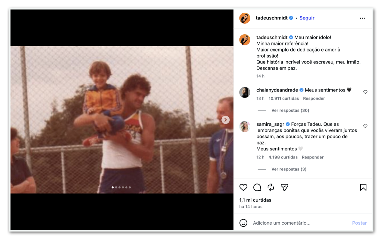 Antes do programa, o apresentador publicou uma despedida em seu perfil oficial no Instagram. Tadeu compartilhou fotografias da infância ao lado de Oscar. Na postagem, escreveu: “Meu maior ídolo! Minha maior referência! Maior exemplo de dedicação e amor à profissão! Que história incrível você escreveu, meu irmão! Descanse em paz”.