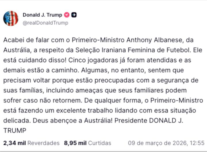 Trump pede à Austrália asilo para jogadoras iranianas de futebol Geral Trump pede à Austrália asilo para jogadoras iranianas de futebol RealRadioTvBrasil março 9, 2026