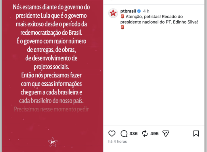 Presidente do PT pede que eleitores atuem como porta-vozes de Lula 2 min read Geral Presidente do PT pede que eleitores atuem como porta-vozes de Lula RealRadioTvBrasil abril 6, 2026